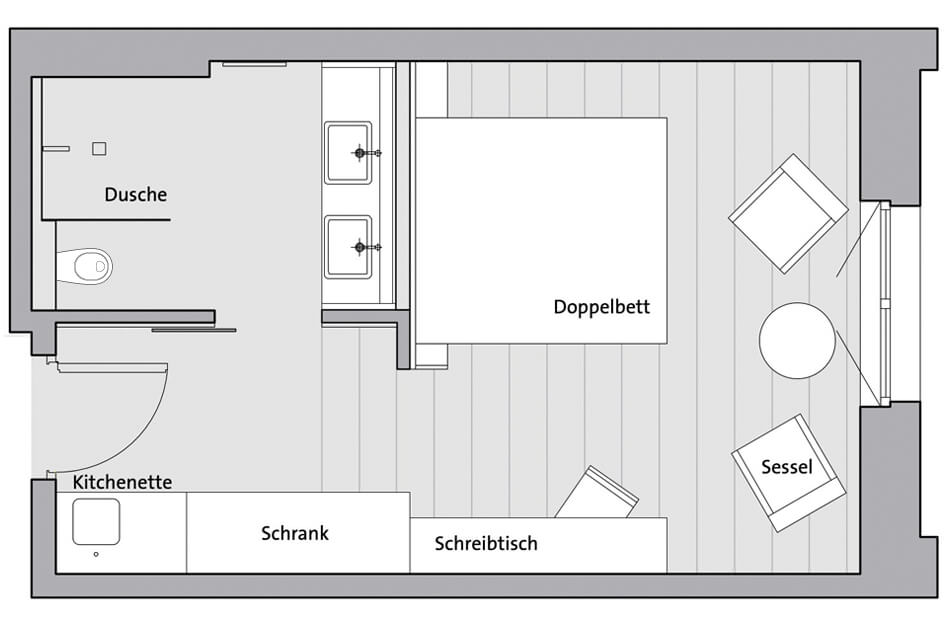 In den Studios stehen zwei Lesesessel sowie ein Schreibtisch zur Verfügung. Unsere Studios verfügen über eine ebenerdige Dusche, die Eckstudios über eine Duschwanne.